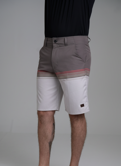 A Bermuda Espectro da Cobra D'agua apresenta uma paleta de cores harmoniosa e sofisticada. A base marrom se complementa com faixas horizontais em tons de cinza, branco, rosa e vinho, criando um efeito visual contemporâneo e versátil. Esse padrão geométrico adiciona dinamismo à peça, permitindo diversas combinações com camisetas básicas, polos ou camisas leves. O corte reto garante um caimento impecável, valorizando a silhueta masculina de forma discreta e elegante. O detalhe do pequeno patch com a logo da marca na lateral direita da perna adiciona um toque de autenticidade e qualidade.