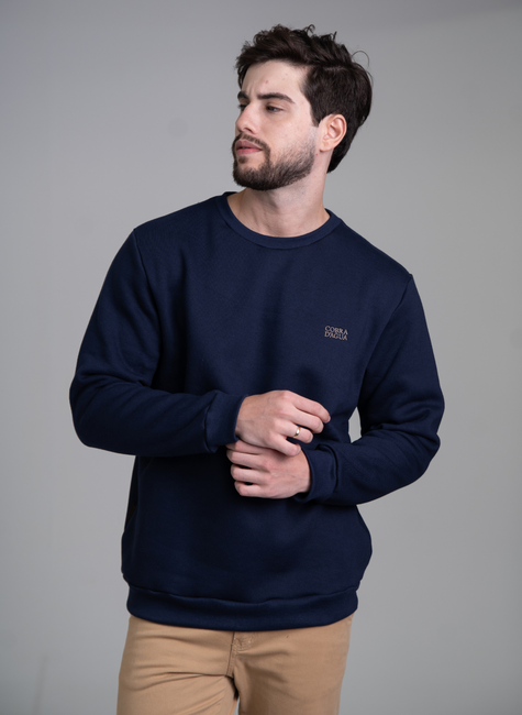 O blusão apresenta um corte "careca" (gola redonda sem capuz) atemporal, que se adapta facilmente a diferentes estilos e silhuetas. A cor marinho profundo confere uma versatilidade incrível, permitindo que a peça seja combinada com uma vasta gama de cores e texturas.