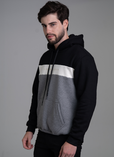 O destaque deste blusão é o seu design recortado, que combina harmoniosamente três tons distintos: o preto profundo nas mangas e parte superior, uma faixa branca nítida no meio do peito, e um tom de cinza elegante na parte inferior e no bolso canguru. Essa combinação de cores não só adiciona um toque contemporâneo, mas também cria um visual dinâmico e versátil, fácil de combinar com diversas peças do seu guarda-roupa.