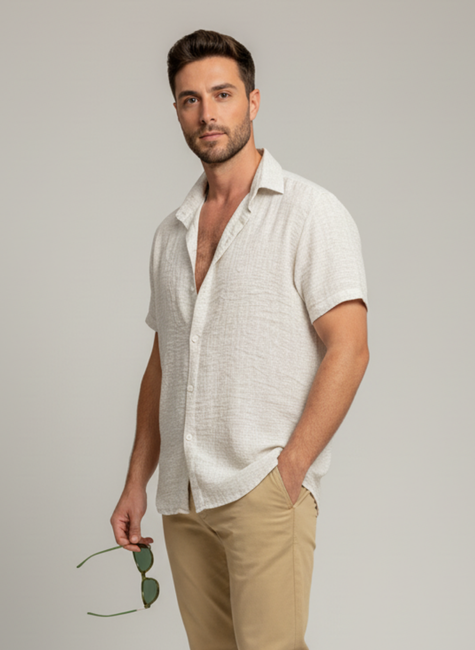 Com modelagem regular e manga curta, a peça acompanha o corpo sem apertar, favorecendo diferentes biotipos. A cor linho cria base neutra que conversa com jeans, sarja e alfaiataria leve, resolvendo do trabalho ao passeio. O fit equilibrado sustenta um look casual masculino atual, atendendo às buscas por camisa manga curta masculina, roupas urbanas masculinas e caimento funcional para a rotina.