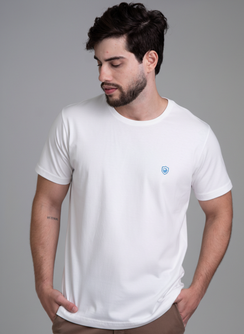 O design minimalista é o grande diferencial. Sem excessos, a camiseta foca na perfeição do corte e no caimento ideal, que se adapta ao corpo masculino de forma elegante, sem ser justa demais ou folgada. O charmoso emblema da Cobra D'agua, delicadamente bordado no peito em um tom de azul que contrasta suavemente com o branco puro, é o selo de autenticidade e bom gosto da marca. É um detalhe sutil que fala volumes sobre a atenção aos acabamentos e a identidade da Cobra D'agua.